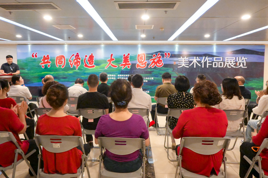 6月17日,由恩施州文学艺术界联合会指导,湖北民族大学人才办、民族学与社会学学院、美术与设计学院及恩施州文化馆、州美术家协会主办,金晖民族美术与理论创作研究工作室承办的“共同缔造 大美恩施”美术作品展览暨座谈会在恩施州文化馆美术展览大厅开幕。