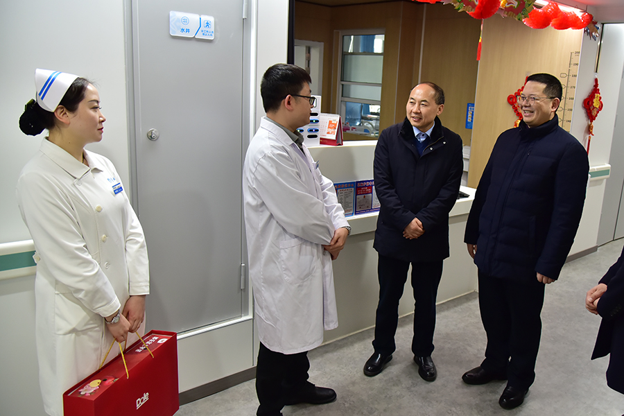 李军一行先后来到心血管内科、小儿内科,为节日值守医护人员送上慰问品,并代表学校对他们在春节期间履职尽责、辛勤工作表示感谢。李军详细询问了医院春节期间值班值守、医疗接诊、后勤保障等情况,强调必须确保春节期间医疗服务有序运行,让每一位住院患者都享受到安全、舒心的医疗服务。
