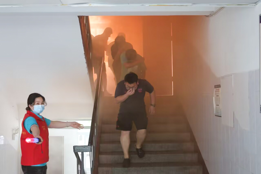 随着火灾警报声响起,学生在物业管理人员的引导下下俯身,用手帕、毛巾等捂住口鼻,沿着安全路线快速疏散,有序撤离到宿舍楼栋外安全区域。保卫工作部(处)接警后,安排应急消防队员第一时间到达现场,学院路消防站消防员到达现场开展模拟灭火演练。